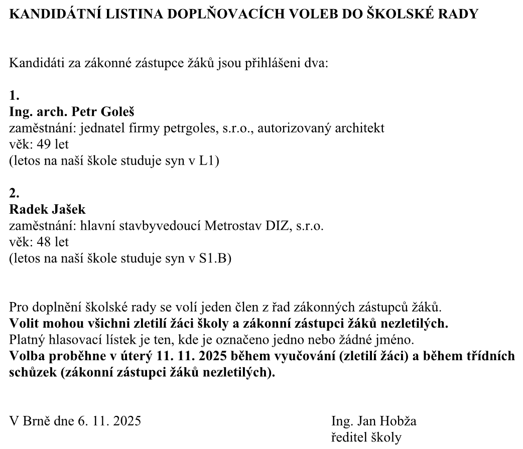 Vyhlášení termínu doplňovacích voleb do školské rady